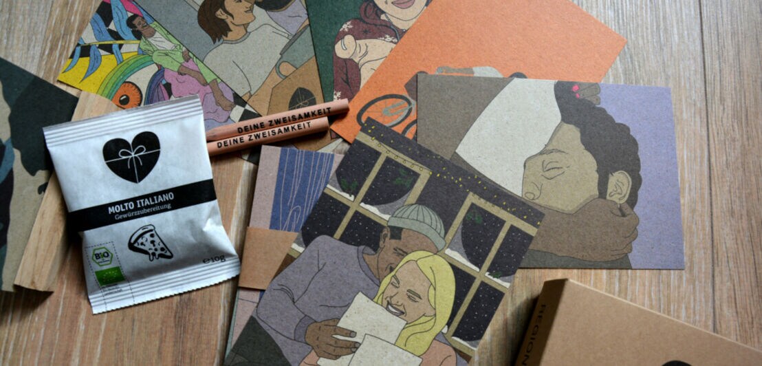 Alle Materialien, die für die Produktion verwendet und verarbeitet werden, sind aus recycelter Pappe und Graspapier. Außerdem arbeiten Deine Zweisamkeit mit lokalen und regionalen Partner:innen zusammen, um ihren Beitrag zum Umweltschutz zu leisten.