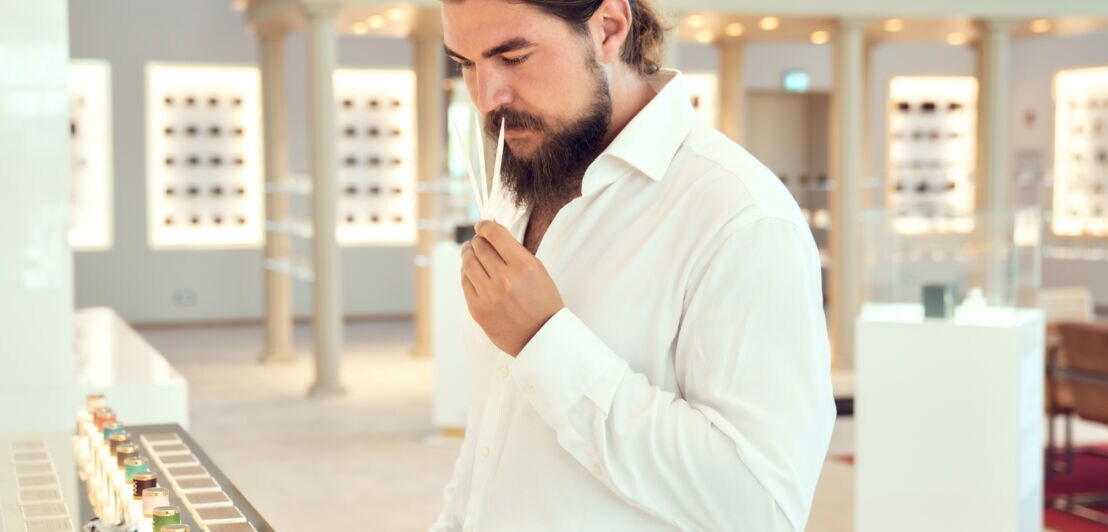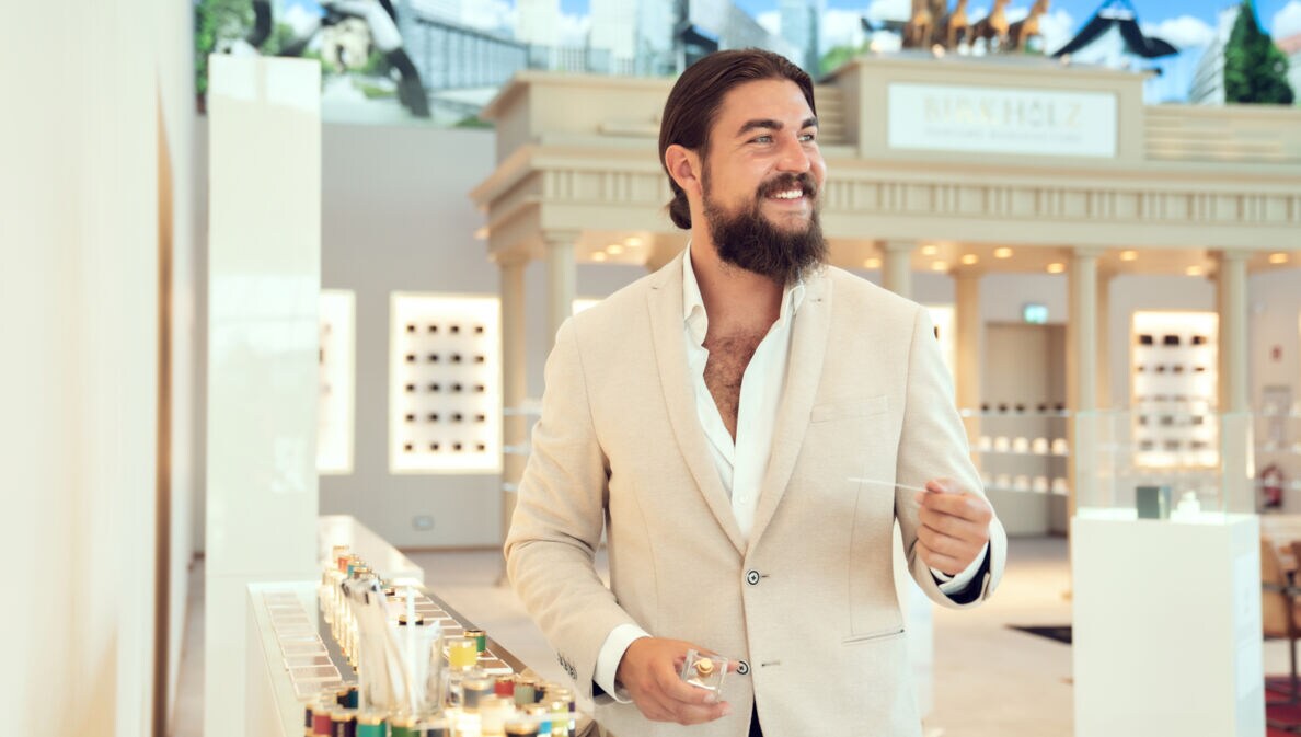 Was ist der Lieblingsduft des Duftsommerliers Philip Birkholz? „Kommt immer auf Anlass und Stimmung an“, sagt er. Dark Amber aus der Black Collection sei ein Favorit, ein anspruchsvoller, pfeffriger Duft mit Nuancen von Vanille und Amber, für Philip Birkholz „ein Duft wie eine Reise über die sieben Weltmeere.“ Das passt gut zu dem jungen Mann mit dem schwarzen Bart und dem zum Dutt hochgesteckten Haar. Er ist ein Kapitän in dem Meer von Düften, die ihn umgeben.