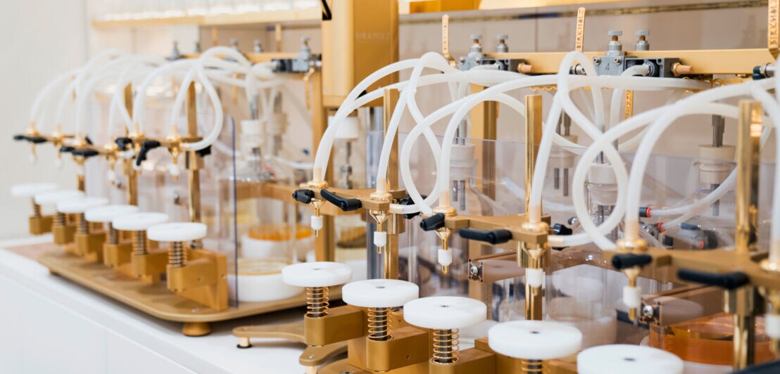 Im Showroom befinden sich Mutter Karin Birkholz sowie Sandra und Ronny, private Kund:innen, die sich zu einer Duftreise in der Birkholz Perfume Manufacture angemeldet haben. Sandra stellt sich ihren individuellen Duft zusammen, auch das macht Birkholz möglich. Die Düfte der Classic Collection sind so angelegt, dass aus zwei bis drei Düften ein neuer kreiert werden kann. Kostenpunkt für 100 Milliliter: 269 Euro.