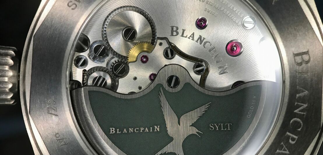 Der Gehäuseboden einer Blancpain-Uhr mit Vogelemblem.