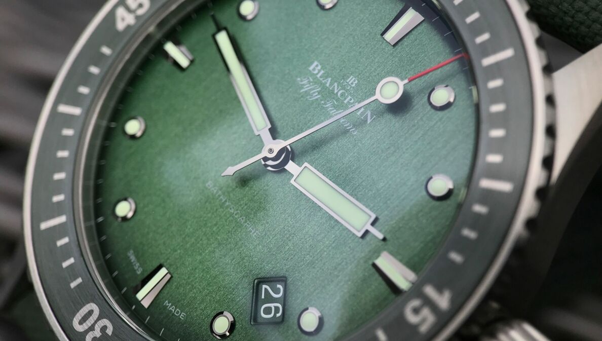 Detailaufnahme einer Blancpain Fifty Fathoms Bathyscaphe mit grünem Ziffernblatt