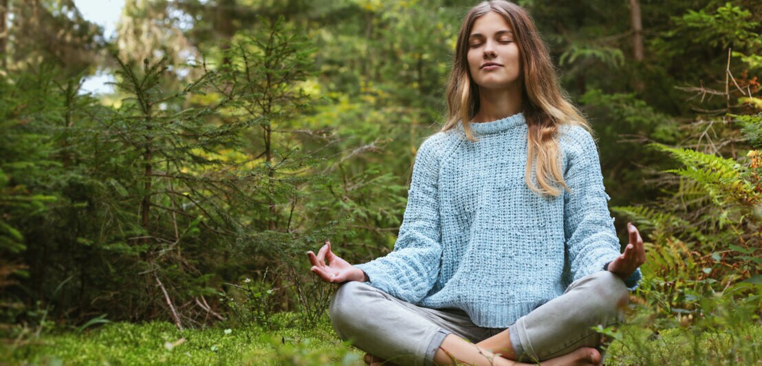Frau meditiert im Wald