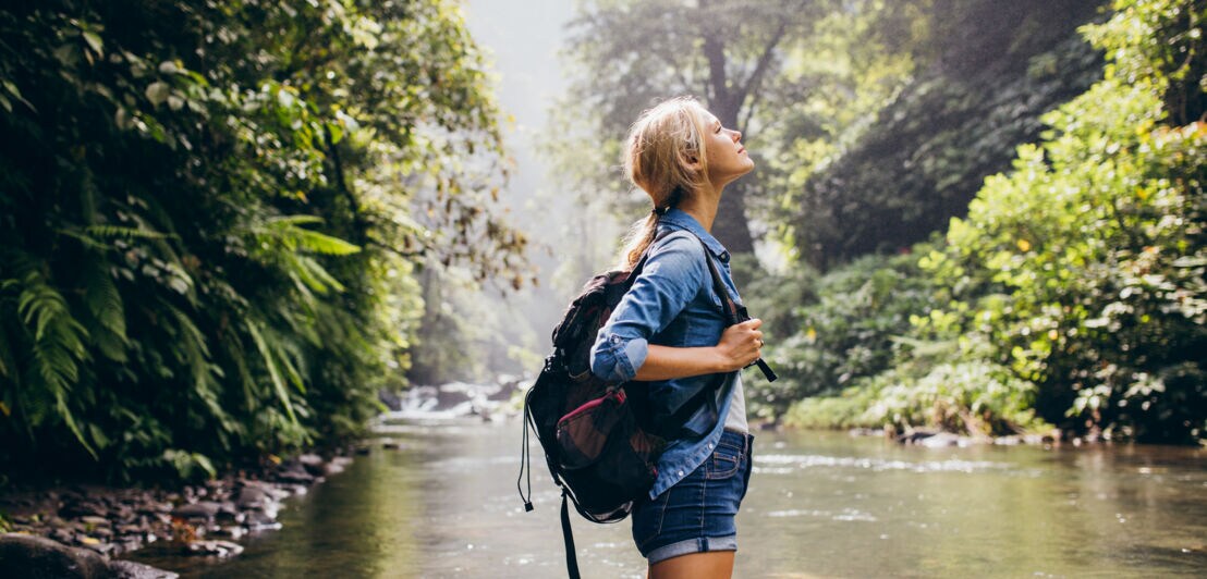 Eine Frau schaut nach oben, im Hintergrund Wasser und grüne Natur