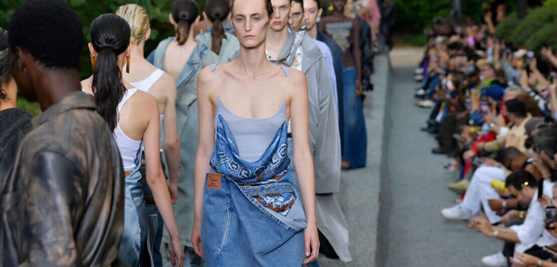 Models in avantgardistischer Jeanskleidung laufen in Reihe auf einem Laufsteg bei einer Modenschau im Freien