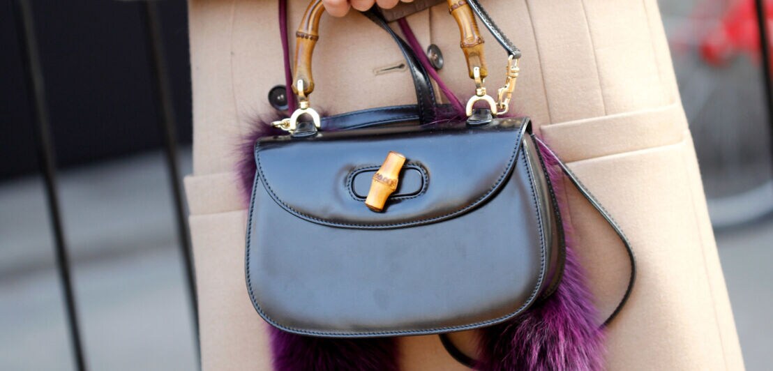 Nahaufnahme einer von Hand gehaltenen schwarzen Lederhandtasche mit Griff und Verschluss aus Bambusrohr