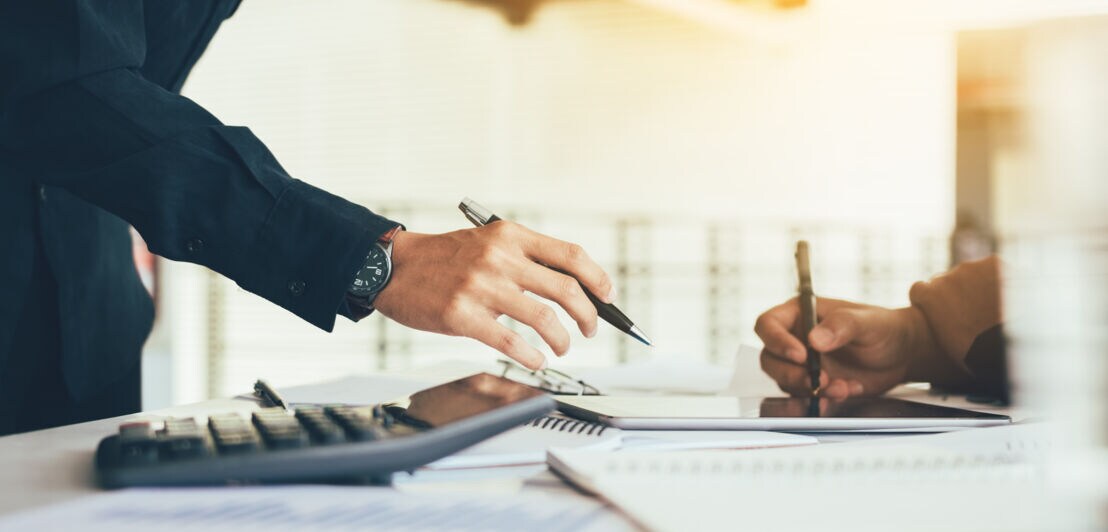 Nahansicht zweier Hände, die mit Stiften, einem Taschenrechner und Notizbüchern auf einem Tisch arbeiten