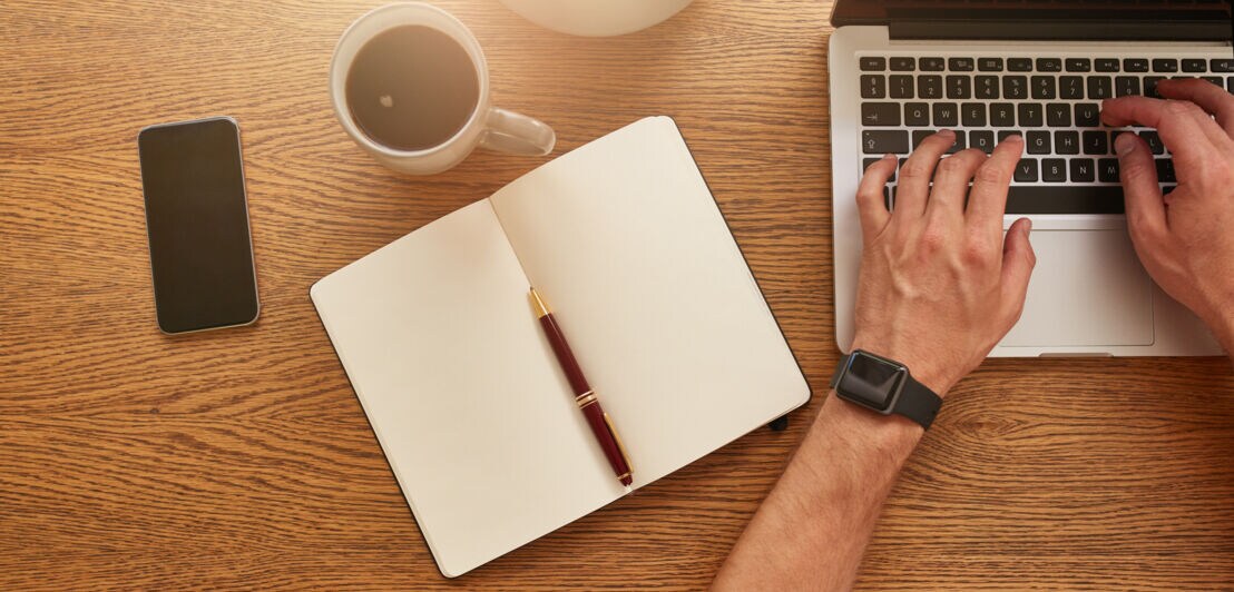 Sicht von oben auf einen Schreibtisch mit Kaffeetasse, Smartphone, Notizbuch und Kugelschreiber, ein Mann arbeitet an einem Notebook