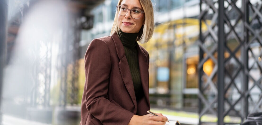 Eine Frau im Blazer sitzt mit einem Notizbuch und einem Kugelschreiber in einer industriell anmutenden Umgebung
