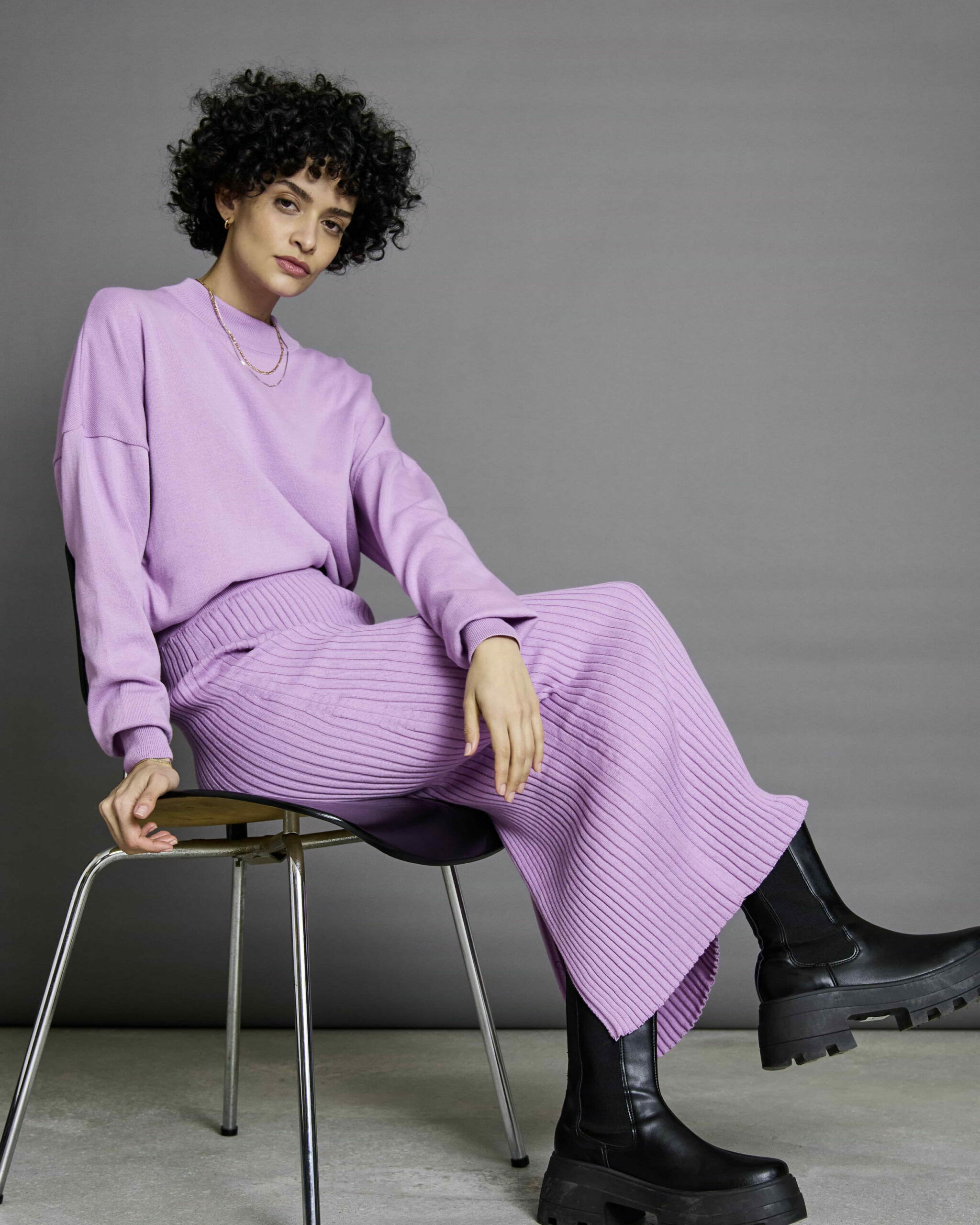 Ein Model mit schwarzen Haaren sitzt auf eine Stuhl und präsentiert fliederfarbene Mode