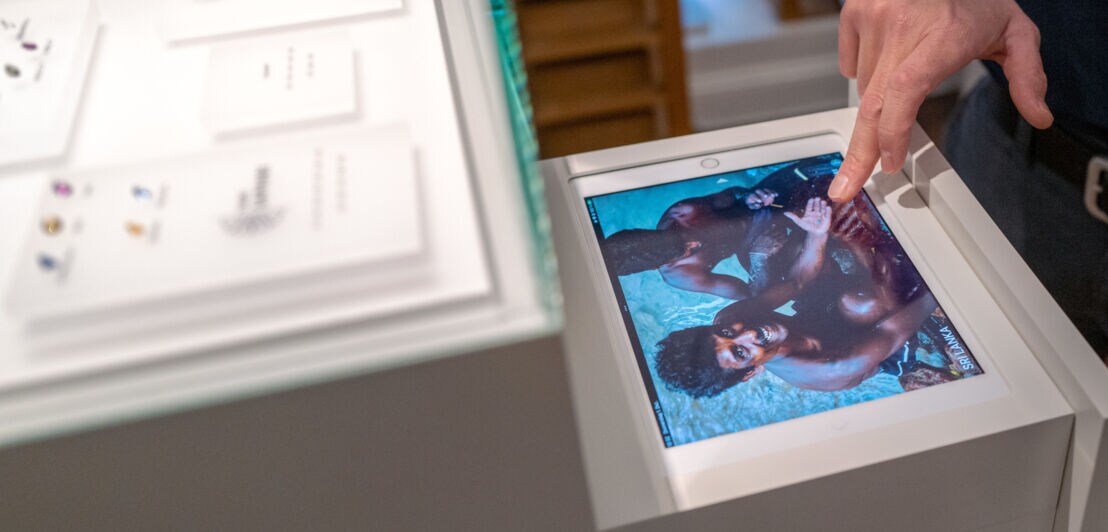 Greenwashing ist Jan Spille fremd. Um sicherzustellen, dass die Zertifizierungen halten, was sie versprechen, reist er regelmäßig nach Südamerika, Afrika und Asien. Er geht zu einer der Vitrinen mit glitzernden Steinen und zieht aus einer Schublade ein Tablet hervor. „Schau mal, das war bei einem Besuch in Sri Lanka, daher kommen unsere fairen Saphire“, sagt er. Die Bilder erzählen die Geschichte der dortigen Arbeiter:innen, wie die Menschen nach Saphiren schürfen und das Rohmaterial später zu funkelnden Steinen schleifen.