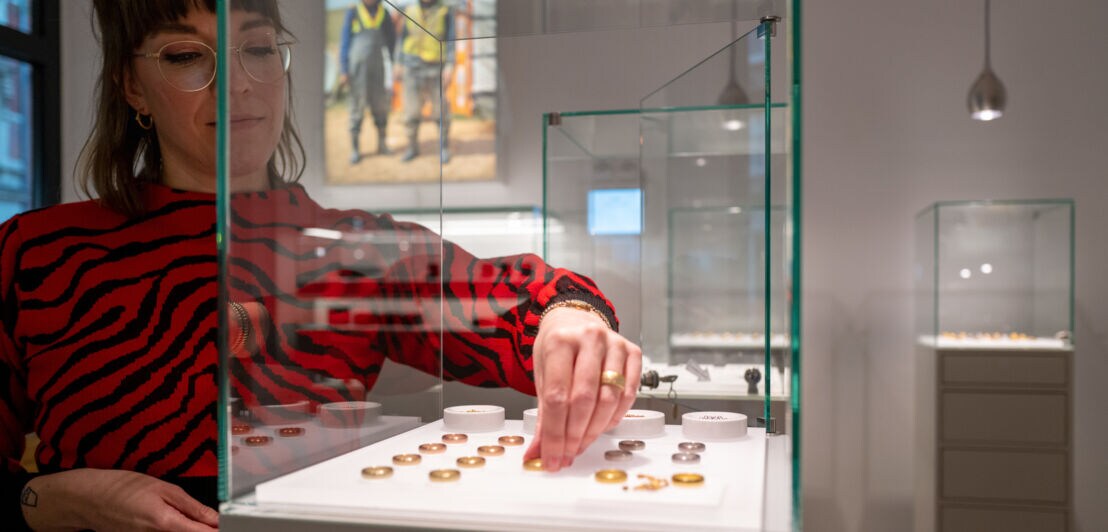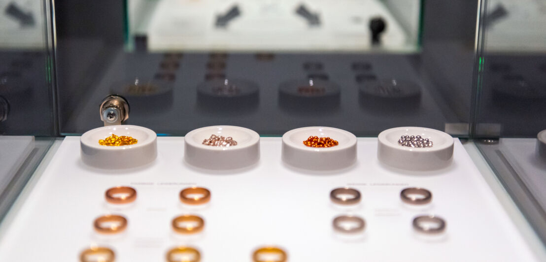 Vor allem Ringe in unterschiedlichen Variationen werden in den edel-minimalistisch gestalteten Auslagen des Ateliers präsentiert – der Schwerpunkt der Goldschmiede liegt auf individuell kreierten Verlobungs- und Eheringen. An der Wand, neben dem Bild der Bergbauarbeiter:innen, hängen Dutzende Fotos strahlender Brautpaare, die Eheringe von Jan Spille in die Kamera halten.