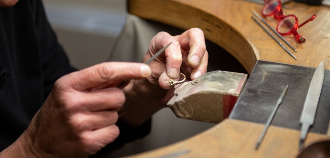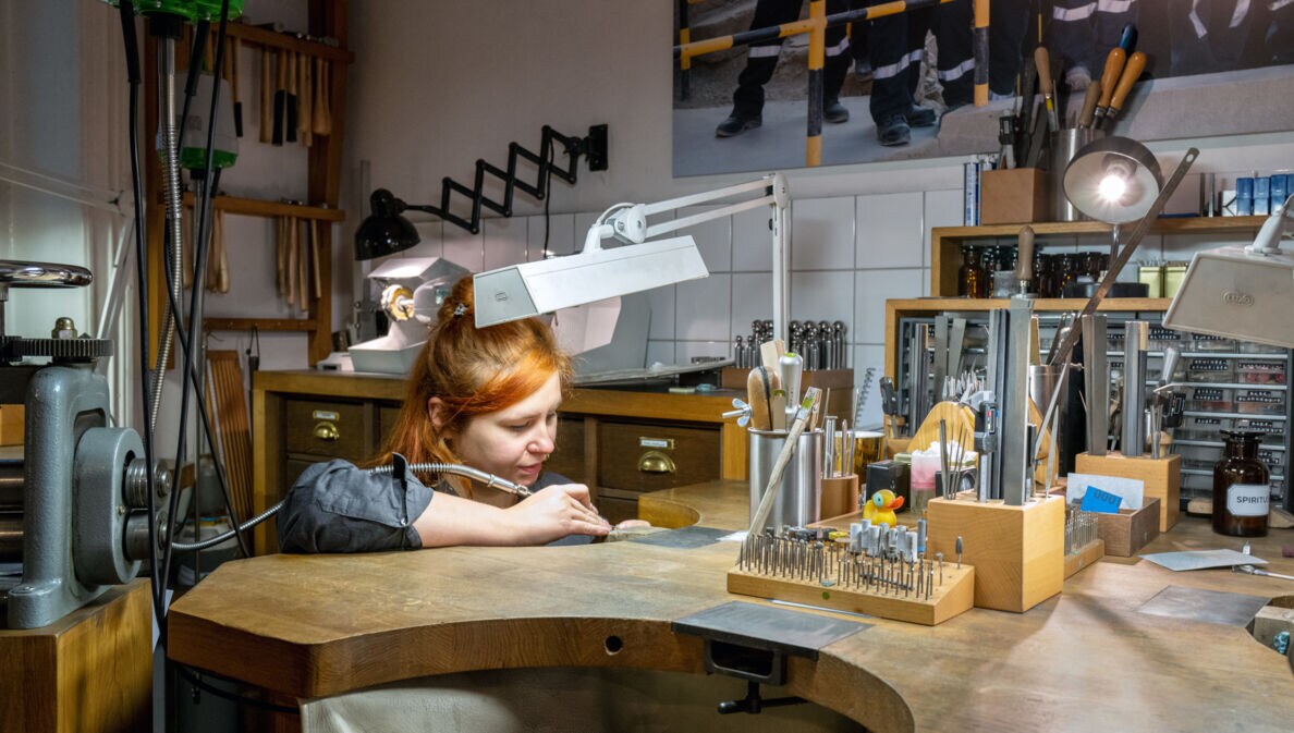 Goldschmiedin Anna schleift an ihrer Werkbank den Ring ein weiteres Mal und staubt ihn mit einem dicken Pinsel ab. Feines Goldpuder sammelt sich in der Schürze, die Fell genannt wird, unter ihrem Arbeitstisch. Denn bei Jan Spille ist nicht nur eindeutig geklärt, woher jedes Gramm Rohstoff stammt, „hier geht auch nichts verloren“, sagt die rothaarige Goldschmiedin mit dem Nasenring.