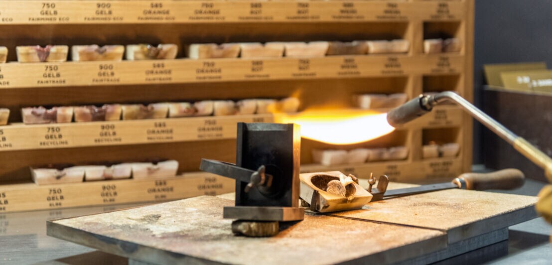 Normalerweise hätten Goldschmiede etwa vier solcher Tiegel. Bei Jan Spille gibt es mehr als 40. „Tatsächlich habe ich noch keine so aufgeräumte Werkstatt gesehen wie diese hier“, sagt Anna und lacht. Wer sein Material so genau kennt wie Jan Spille und Team, muss einfach exzellent sortiert sein.