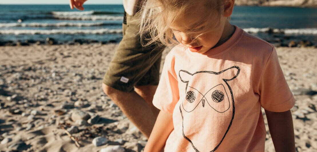 Ein kleines Mädchen am Strand trägt ein T-Shirt mit Eulen-Print