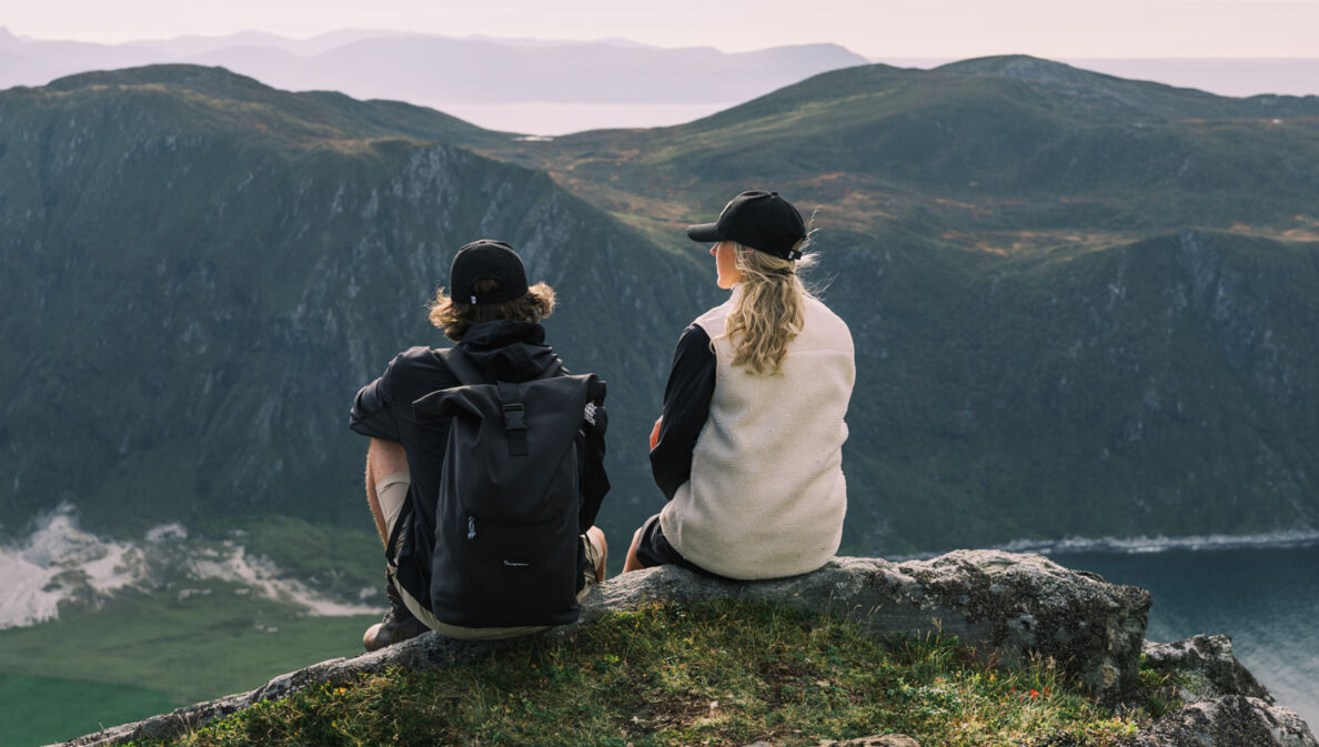 Eine Frau und ein Mann sitzen auf einem Bergvorsprung und schauen in die Ferne