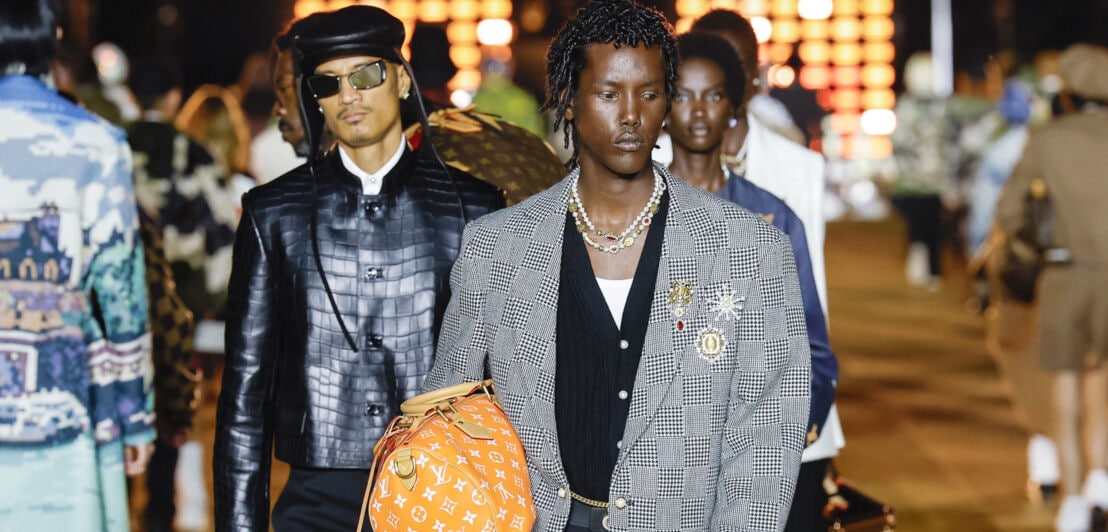 Männliche Models auf einem Laufsteg während einer Modenschau von Louis Vuitton