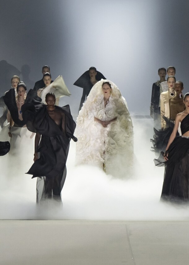 Durch Drapierungen, Faltungen und asymmetrische Silhouetten entstehen avantgardistische Looks, die das Label international sichtbar machen.