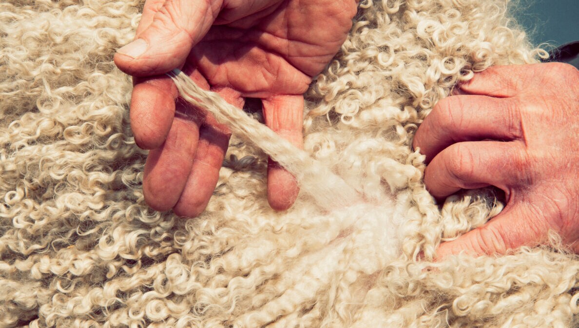 Nahaufnahme von zwei Händen, die eine lockige Strähne im Fell einer Angoraziege langziehen