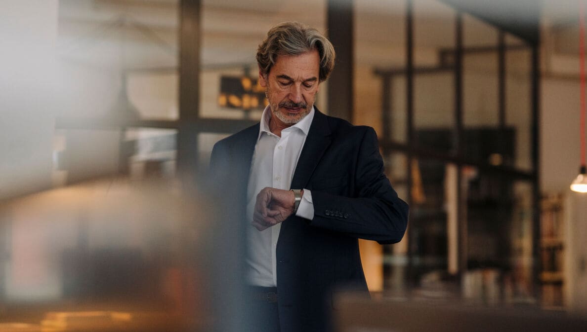Ein Mann in Anzug schaut auf seine Armbanduhr