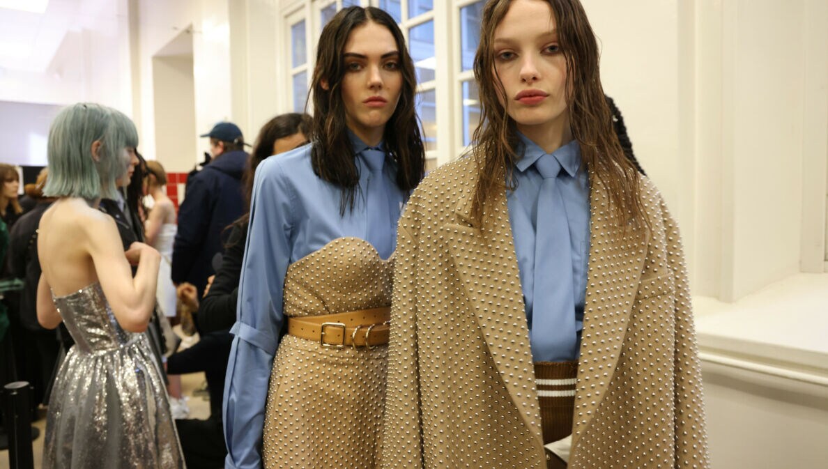 Zwei weibliche Models in eleganter Kleidung in der Farbkombination Beige und Hellblau im Backstage-Bereich einer Modenschau