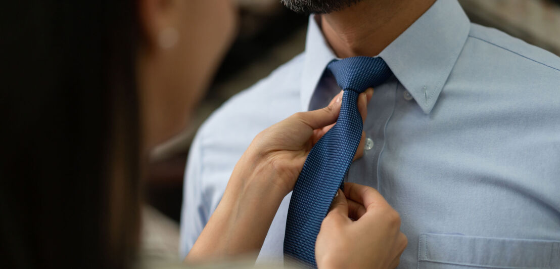 Nahaufnahme von zwei weiblichen Händen, die eine blaue Krawatte am Hals eines Mannes im hellblauen Hemd binden.
