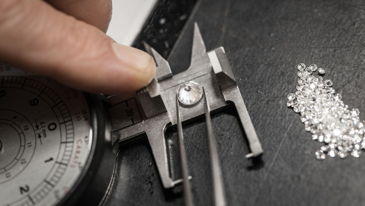 Eine Pinzette, die einen Diamanten auf die Waage legt, die von einem Finger gehalten wird, daneben liegen kleine Diamanten