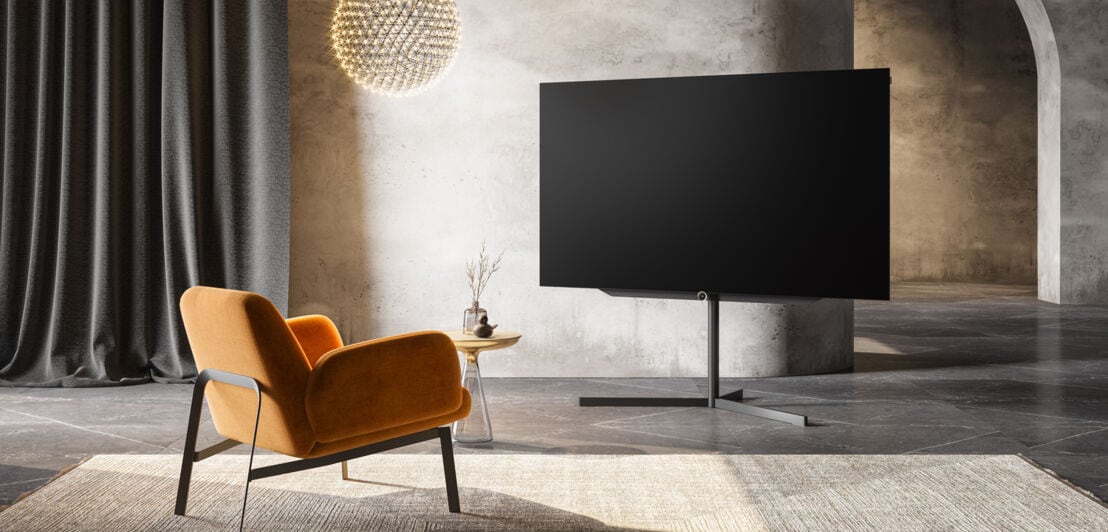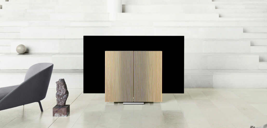 Der dänische Kleinserienhersteller Bang & Olufsen verkauft herausragende Designerstücke, die ganz nebenbei auch noch erstklassige Boxen, TV-Geräte oder Musikanlagen sind. Der Beovision Harmony mit 88 Zoll Bildschirmdiagonale und 8K-Display ist ein solcher Hingucker und lässt sich gut mit Designlautsprechern aus dem gleichen Haus kombinieren. Beim Start des Smart-TV rotieren die Boxen langsam zur Seite, der dahinter liegende Bildschirm gleitet sanft nach oben. Ab 46.300 Euro (UVP) ist das Raumkunstwerk aus dem Norden zu haben.