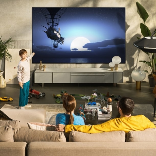 Nice to know: Wenn du einen etwas kleineren Fernseher suchst, findest du mit Samsung The Frame beim selben Hersteller ein bildschönes Gerät, das sich mit seinem Designerrahmen gut in jeden Raum einfügt.