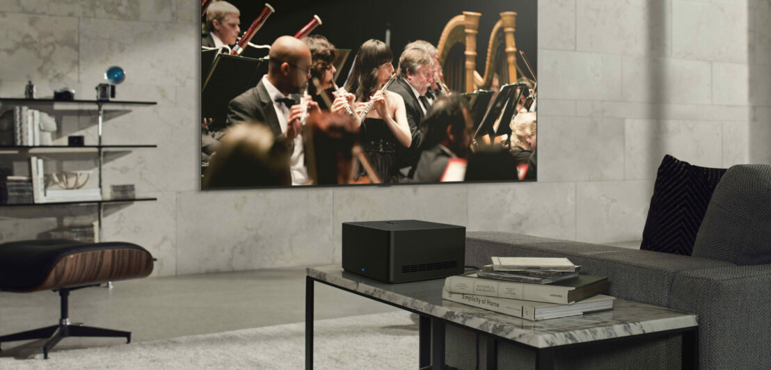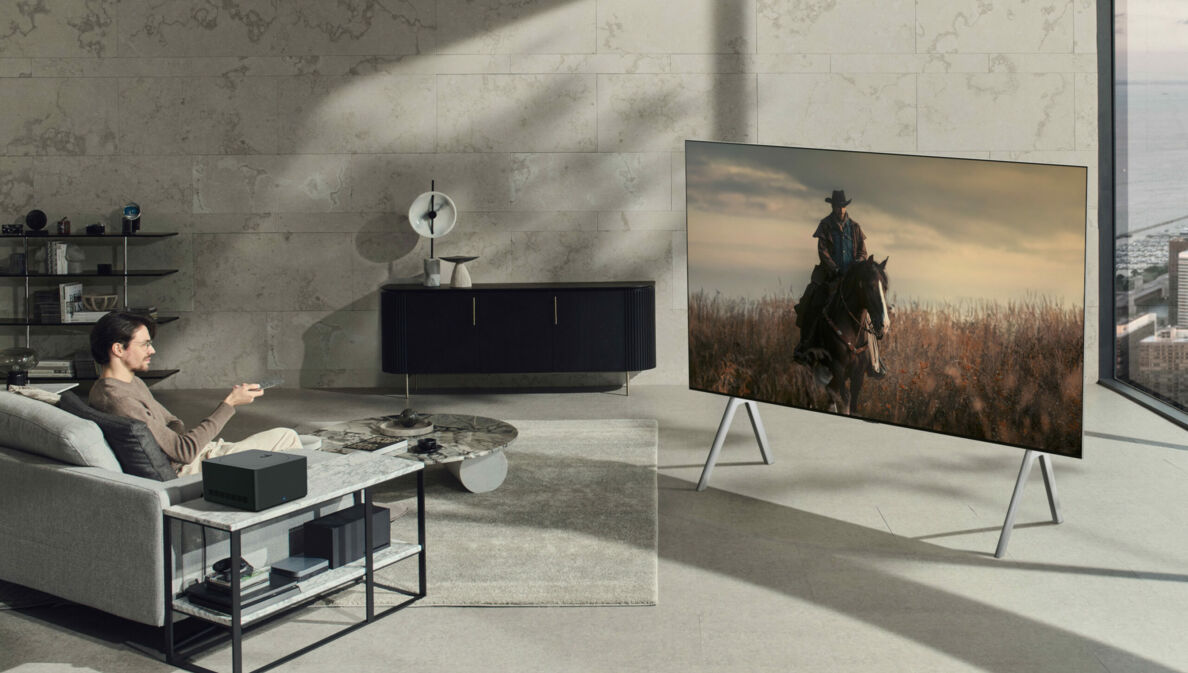 Anschlüsse und „Gehirn“ des TVs sind in einem separaten Gehäuse untergebracht, der Zero Connect Transmitter Box, an der auch Spielkonsolen, Soundbars und Blu-Ray-Player angeschlossen werden können. Bis zu neun Meter weit kann die Box vom Fernseher entfernt platziert werden – allerdings in Sichtweite.