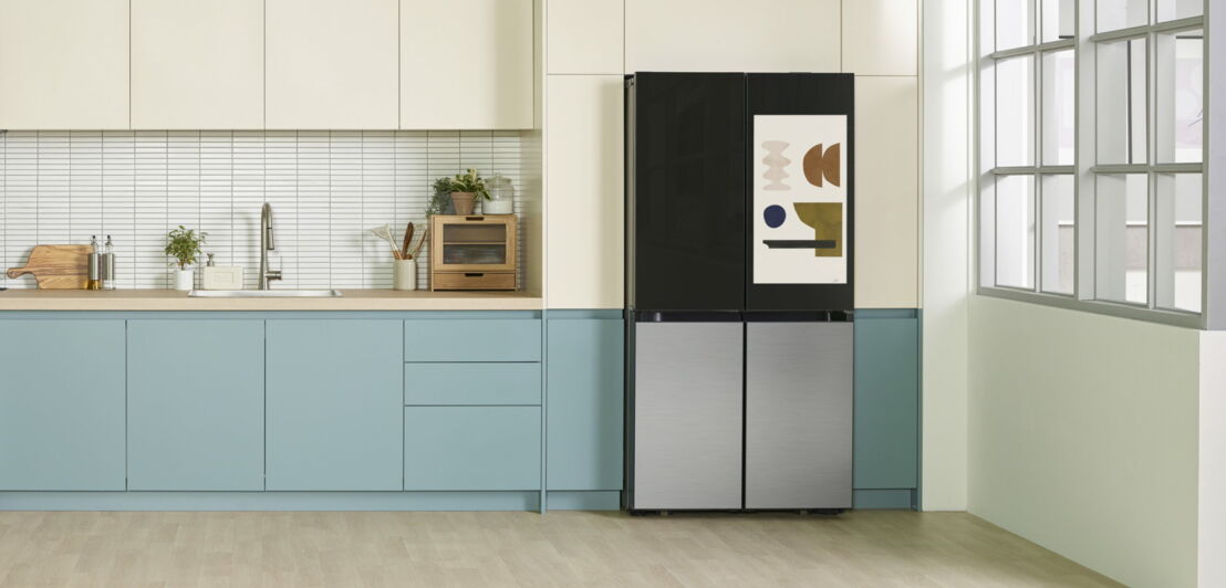 Eine helle Küche mit großem Kühlschrank, der ein Touchscreen besitzt.