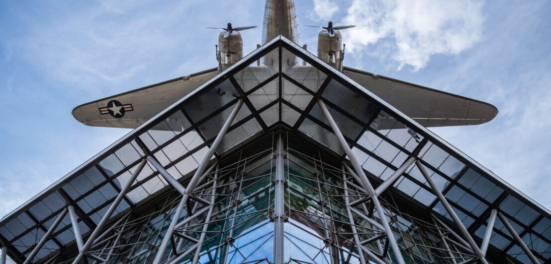 Schon aus weiter Ferne weist sie als Wahrzeichen vom Dach des Neubaus den Weg zum Museum: Die Douglas C-47 Skytrain, die als „Rosinenbomber“ mit vielen anderen Flugzeugen dieses Typs einst die Luftbrücke bildete und West-Berlin während der Berlin-Blockade 1948/49 mit Lebensmitteln versorgte.