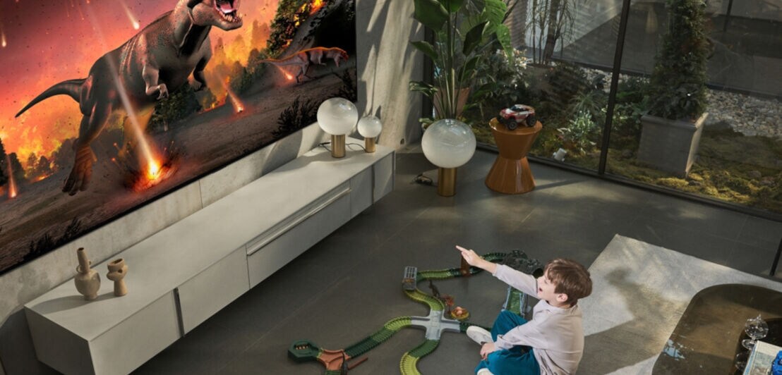 Ein Junge sitzt in einem Wohnzimmer und zeigt auf einen großen Fernseher, auf dem ein Dinosaurier zu sehen ist