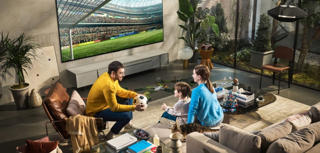 Eine Familie sitzt in einem Wohnzimmer vor einem großen Fernseher, auf dem ein Fußballfeld zu sehen ist, der Mann lächelt das Kind und die Frau an und hält einen Fußball in den Händen