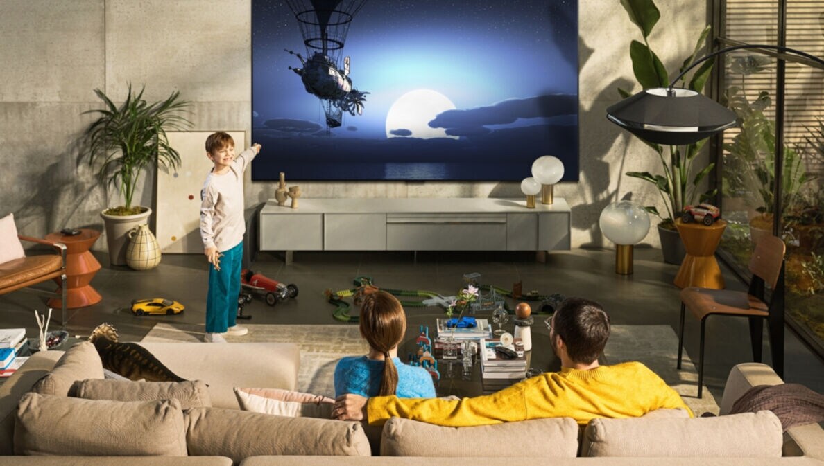 Ein Mann und eine Frau sitzen auf einem beigen Sofa und schauen auf einen großen Fernseher, davor steht ein Junge und zeigt auf den Bildschirm