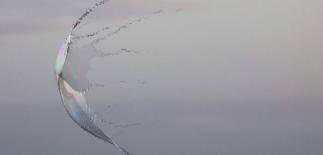 Ist das technische Equipment vorhanden, kannst du dich der Seifenlauge widmen. Du hast zwei Möglichkeiten: Entweder kaufst du eine Fertigmischung in einer kleinen Flasche oder du mischst die Seifenlauge selbst. Für Letzteres mischst du vorsichtig fünf Teile kaltes oder lauwarmes Wasser, zwei Teile Spülmittel sowie etwas Zucker und lässt die Flüssigkeit ein paar Stunden ziehen. Wer größere Mengen braucht, zum Beispiel für Aufnahmen mit Kindern in einer Seifenblasenwolke, nimmt 1,5 Liter Wasser, 125 Milliliter Spüli und 125 Gramm Maisstärke. Oft wird auch Glycerin als Hilfsmittel verwendet, was aber wegen seiner Gewinnung aus Erd- oder Palmöl umstritten ist.