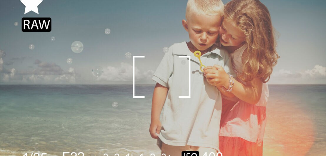 Der Blick durch eine Kamera, im Vordergrund sind die Einstellungswerte zu sehen, im Hintergrund zwei Kinder mit Seifenblasen am Strand