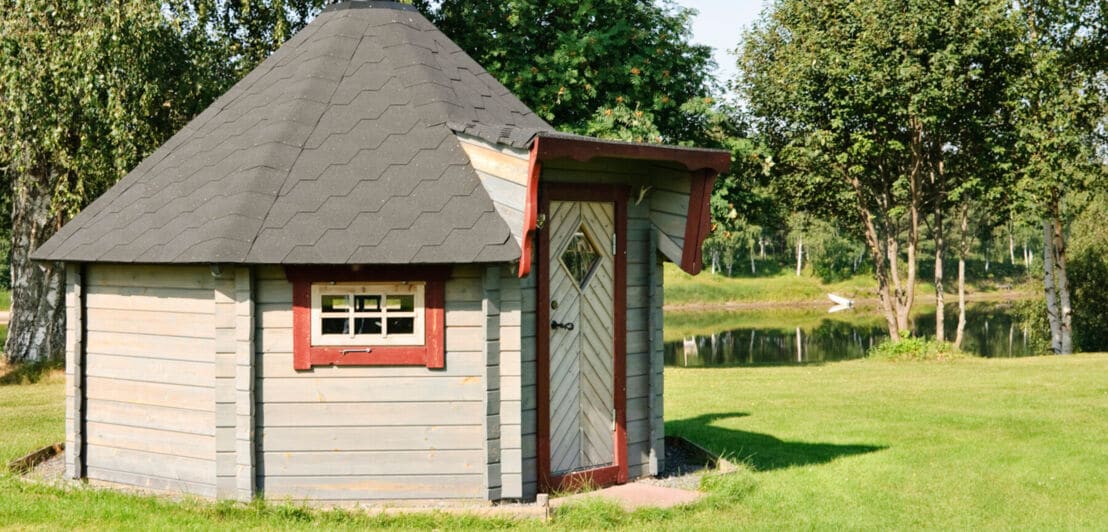 Blick auf eine Gartensauna in Schweden