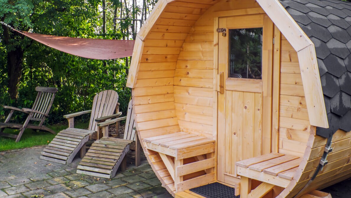 Fasssauna aus Holz im Garten mit Liegestühlen