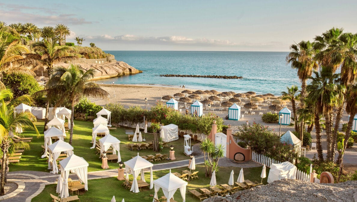 An der Südwestküste von Teneriffa liegt ein 5-Sterne-Hotel, dessen Gebäude im maurischen Stil eine stimmungsvolle Kulisse für deinen Urlaub bilden. Neben sieben Pools bietet das Resort einen exklusiven Strandbereich mit kostenlosen Sonnenliegen und Sonnenschirmen für seine Gäst:innen.