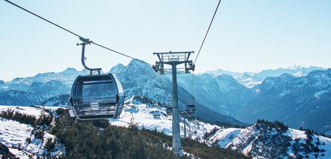 Skilift mit gläserner Gondel vor winterlichem Bergpanorama