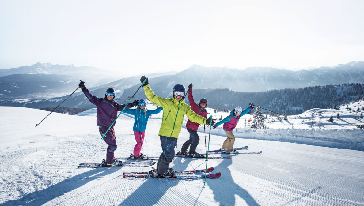 Fünf Skifahrende in bunter Kleidung winken in die Kamera auf einer Piste vor winterlichem Bergpanorama
