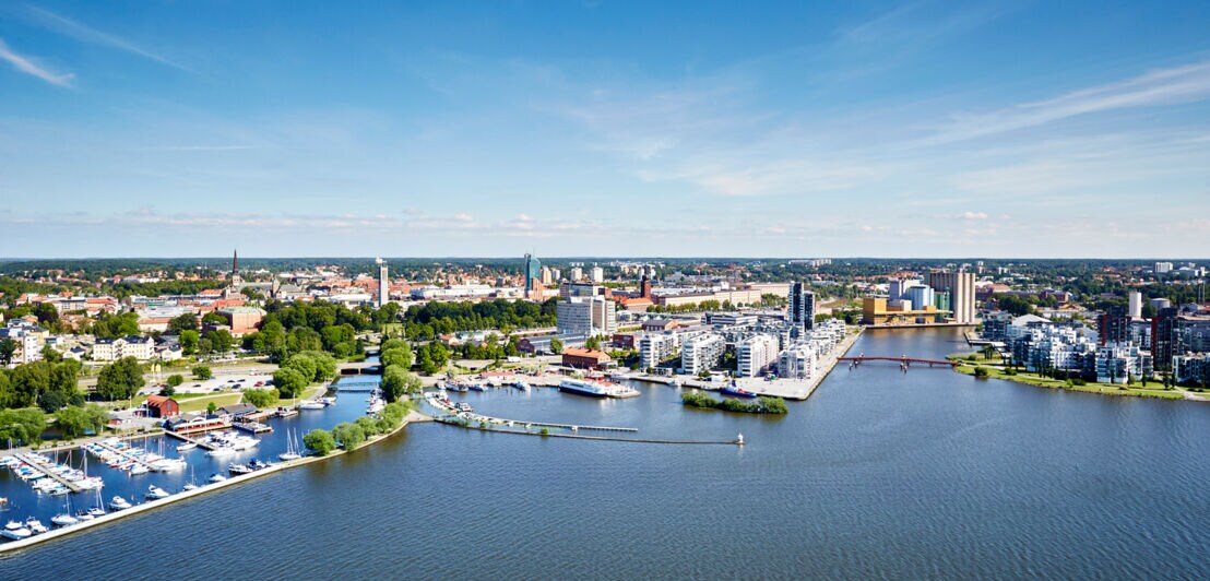 Ein Bild aus der Luft vom See aus auf eine Stadt