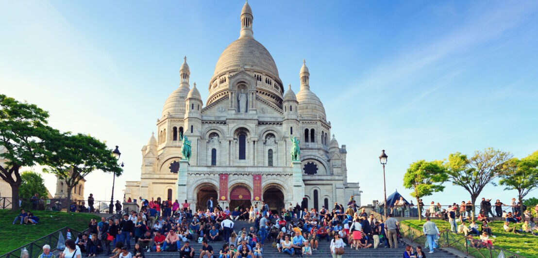 Auf den Treppen vor der strahlend weißen Basilica minor Sacré-Cœur blickt ihr über das beleuchtete Paris. Romantischer geht’s kaum.