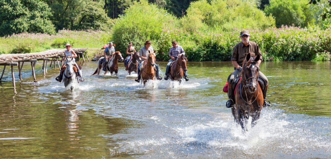 Eine Personengruppe durchquert auf Pferden einen Fluss