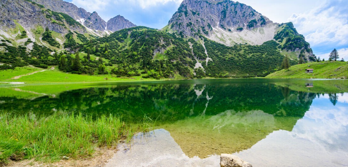 Schließlich ist es geschafft: Der Untere Gaisalpsee ist erreicht. Wo sein Wasserfall in den Gaisalpbach rauscht, kannst du entspannen und ein Picknick genießen. Wer keine Angst vor kaltem Wasser hat – wärmer als 10 bis 15 Grad Celsius wird der glasklare See auch im Sommer nicht –, darf gern ein Bad nehmen.