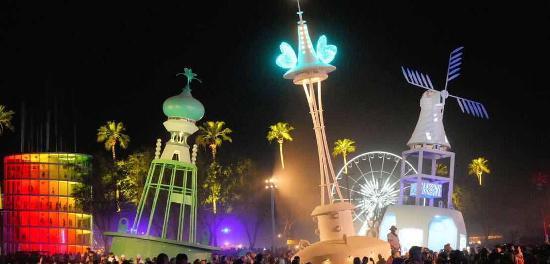Zu den knapp 89.000 Einwohner:innen gesellen sich während des Coachellas rund 250.000 Besucher:innen, 125.000 je Wochenende, darunter zahlreiche Prominente und Influencer:innen. Für alle Anwesenden gibt es nicht nur etwas auf die Ohren: Neben den Musiker:innen auf der Bühne präsentieren beim Coachella zahlreiche Künstler:innen ihre Skulpturen und Installationen auf dem Areal.