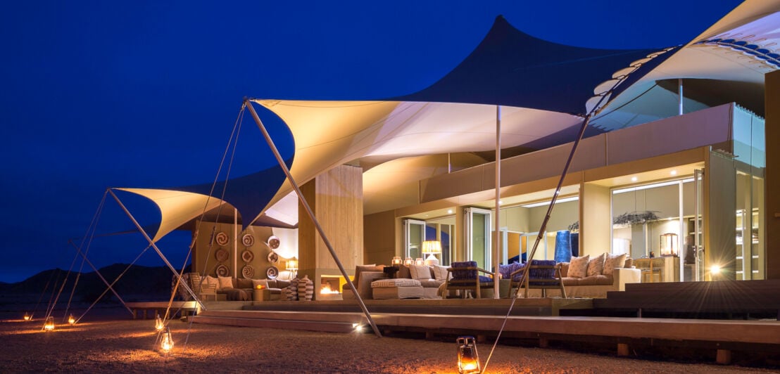 Als wäre die Nähe zum Skeleton Coast Nationalpark nicht bereits verlockend genug, besticht das Hoanib Skeleton Coast Camp durch einen einzigartigen Design-Stil. Auf den Safari-Trips kannst du Wüstenlöwen, Giraffen, Elefanten, aber auch die Dünen-Oasen oder die naheliegende Küste bestaunen.