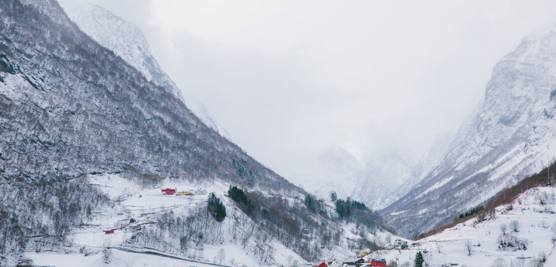 Einer der schönsten Seitenarme des Sognefjords ist der Nærøyfjord. Wild-romantisch schlängelt er sich zwischen steil abfallenden Bergen mit Schnee auf den Kuppen dahin. Rauschende Wasserfälle und eine rau-romantische Kulturlandschaft mit kleinen Höfen, die sich an die Hänge drücken, säumen seinen Weg. Der Nærøyfjord ist circa 18 Kilometer lang, seine schmalste Stelle gerade mal 250 Meter breit. Weil Landschaft, Fjord und Wasserfälle so wild-rau-romantisch schön sind, gehört dieser Fjord zum UNESCO-Weltnaturerbe.