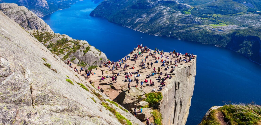 Nice to know: Am Lysefjord findet sich auch die am meisten fotografierte Sehenswürdigkeit Norwegens: der Kjeragbolten, ein zwischen zwei Felswänden eingeklemmter riesiger Felsbrocken. Wer mutig ist, klettert hinauf. Ein beruhigender Gedanke gegen das Nervenflattern: Mit dem Premium-Versicherungspaket der Gold oder Platinum Card sind du und deine Familie auf Reisen bestens abgesichert.*