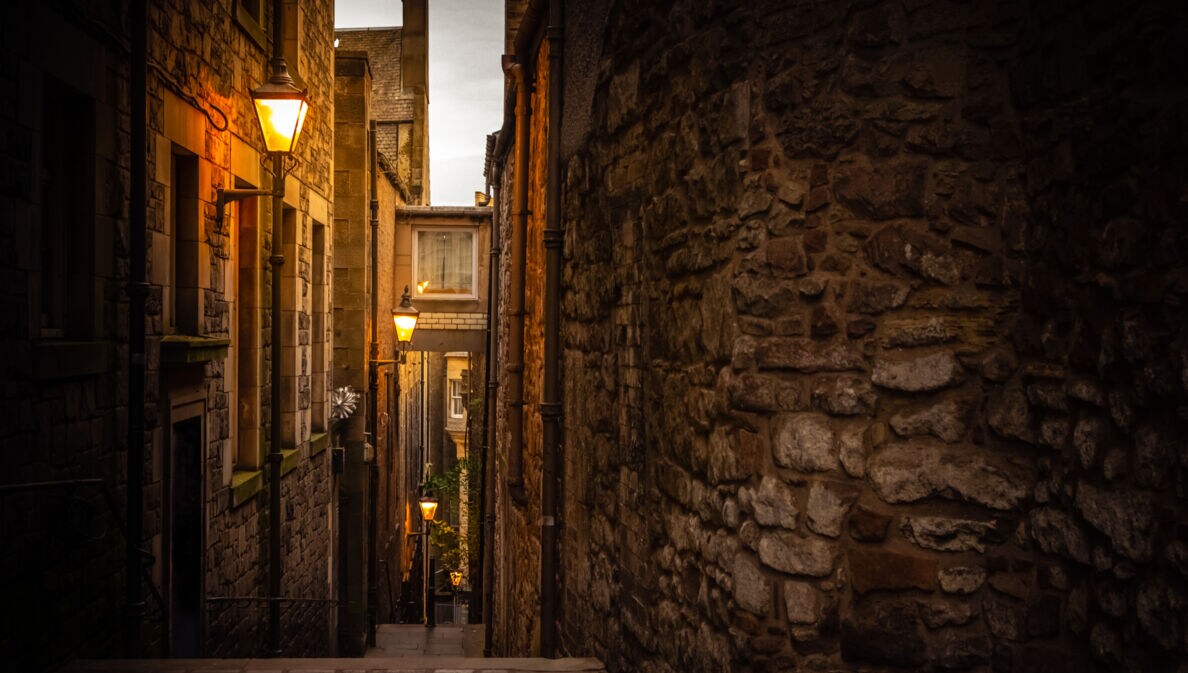 Dunkle Gasse in Edinburgh, die von Straßenlaternen schwach beleuchtet wird.